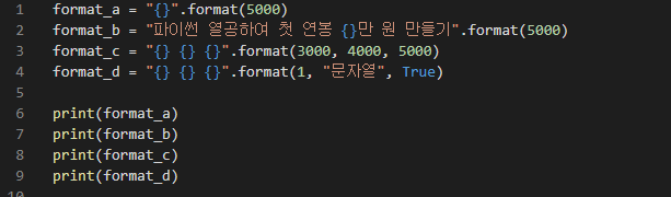 - 중괄호 포함한 문자열 뒤에 마침표를 찍고 format()함수 사용하되 중괄호 개수와 format함수 안