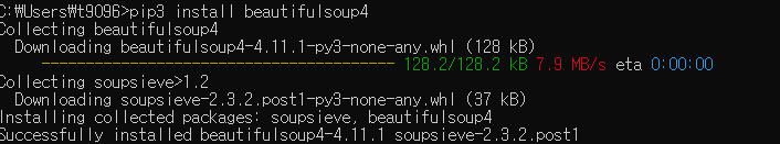 - [Window] + [R] 클릭하여 프로그램 실행창을 띄우고 pip3 install beutifulsoup4로 외부 모듈 설치