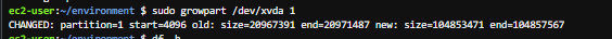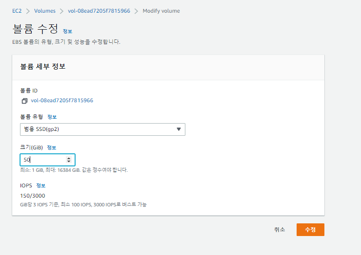 aws -> ec2 -> 볼륨 -> 작업 -> 볼륨 수정 (50으로)
