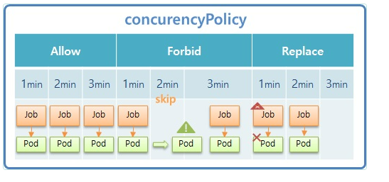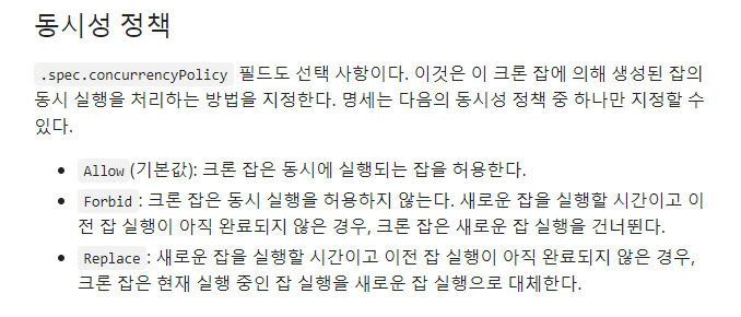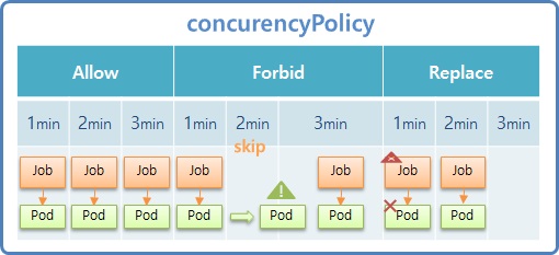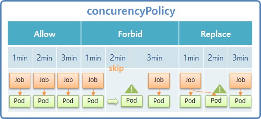 - concurencyPolicy가 있음 (Allow, Forbid, Replace)