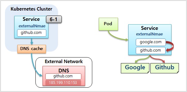 - Service에 ExternalName을 넣어 도메인을 넣으면 DNS cache을 통해 IP를 찾아냄