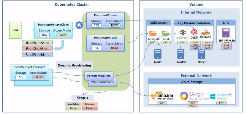 - 모든 PV에는 Pod처럼 각각의 Status가 존재하여, PV와 PVC의 연결 상태와 에러 등을 알 수 있음