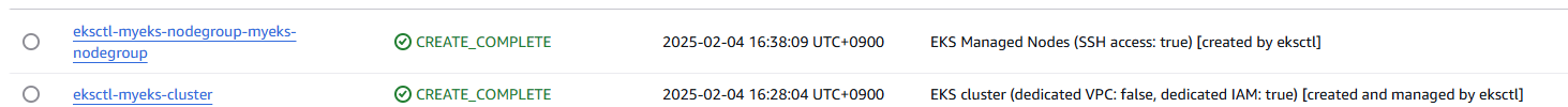 eksctl 명령을 하면 cloudformation 스택이 생성되며 해당 작업들을 수행합니다.