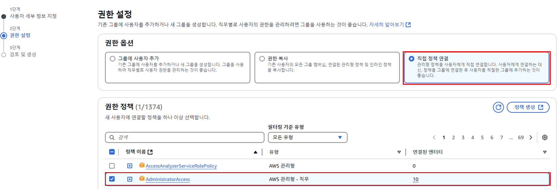 4. 직접 정책 연결 -> AdministratorAccess 선택 후 다음