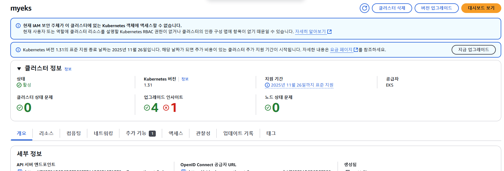 또한 콘솔에서도 만들어진 EKS 클러스터를 확인할 수 있습니다.