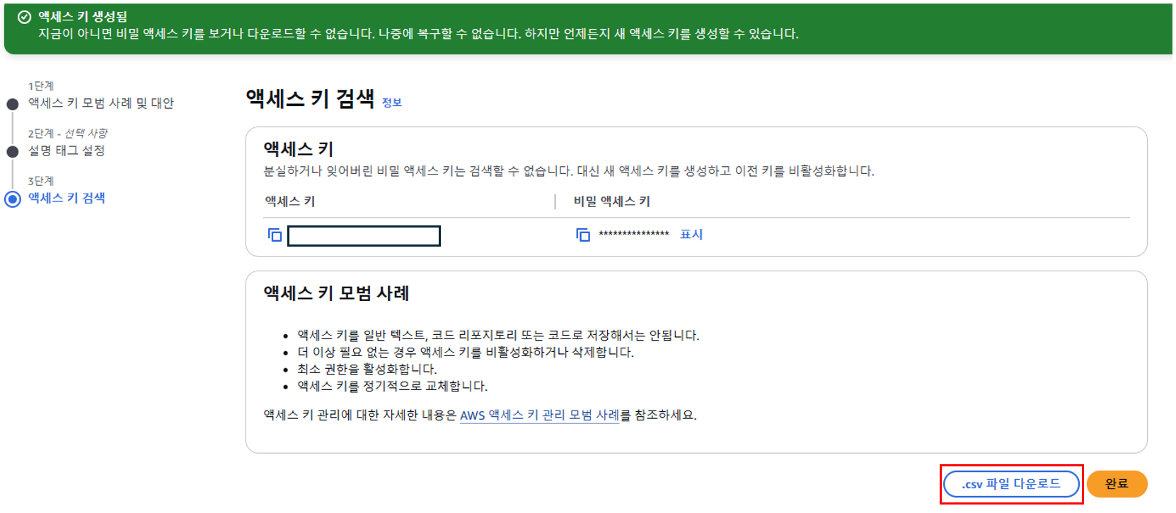 현재 Administrator 권한의 IAM User을 생성하였기 때문에 엑세스 키가 유출되지 않도록 정말 조심해주세요!!