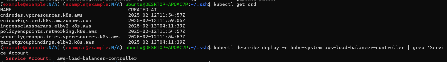 설치하면 crd에 추가된 것을 확인할 수 있으며, aws-load-balancer-controller라는 SA를 사용함을 확인할 수 있습니다.