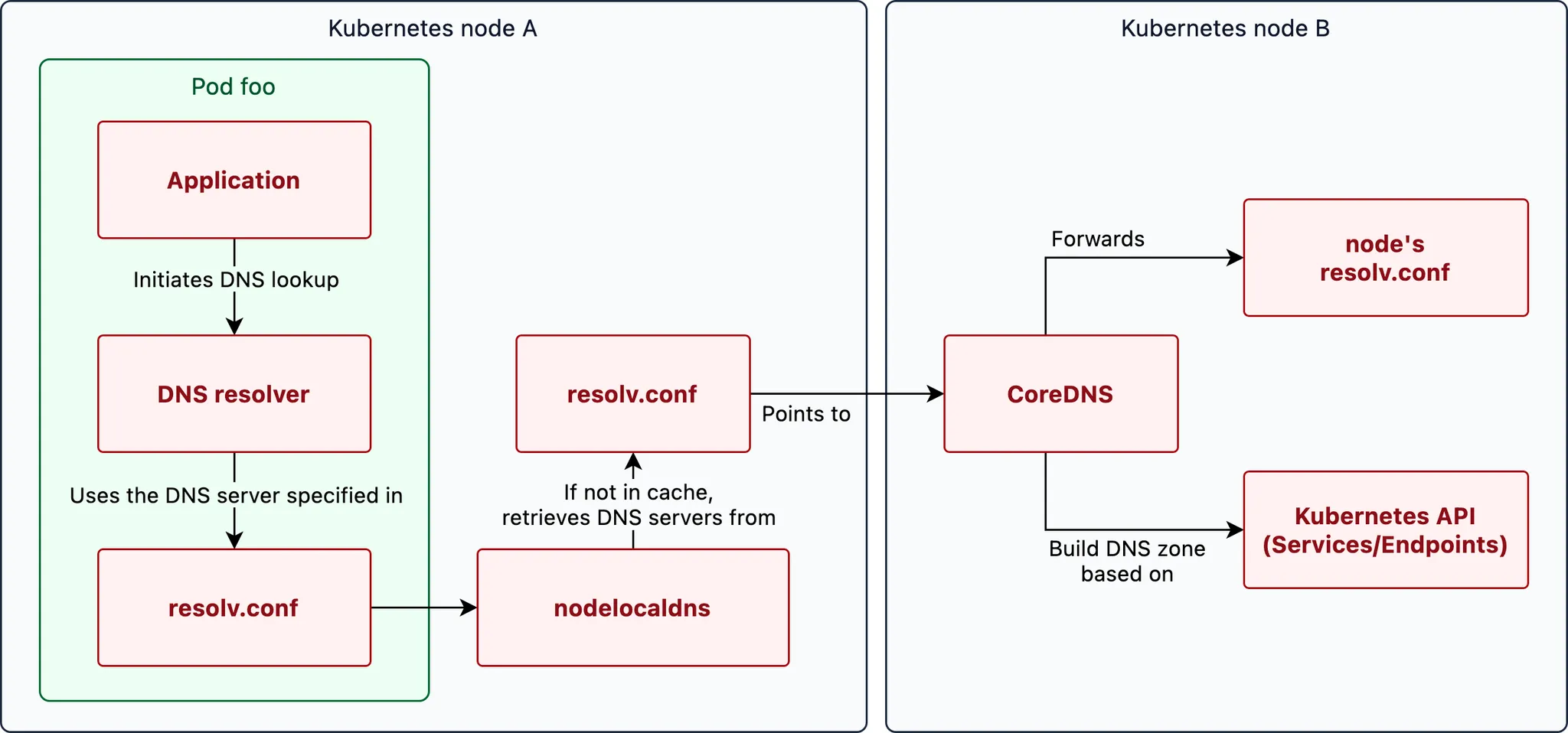 In Kubernetes, DNS queries follow a specific path to resolve the IP address of a hostname. Here are all the steps and components it goes through.