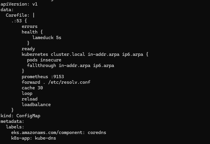 * 기본 CoreDNS의 설정 파일은 Corefile에서 확인이 가능합니다.