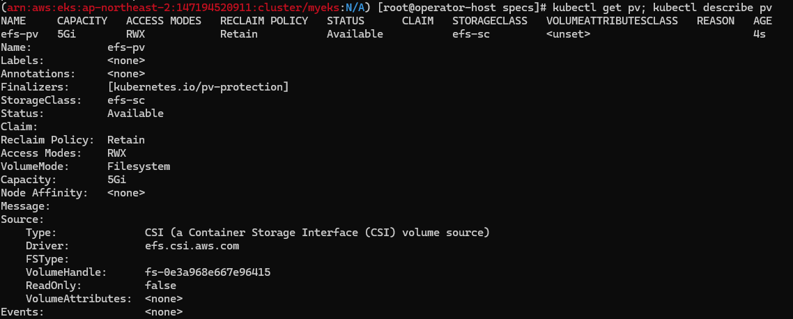 kubectl get pv; kubectl describe pv