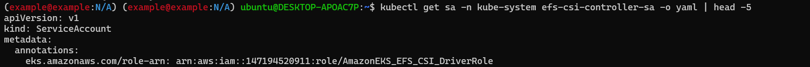 kubectl get sa -n kube-system efs-csi-controller-sa -o yaml | head -5