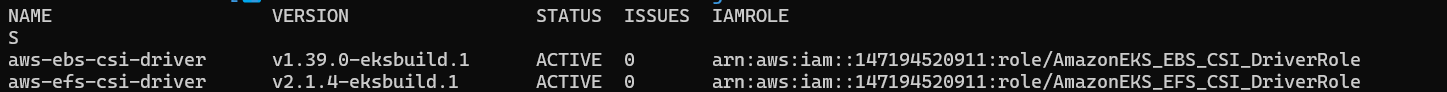 eksctl create addon --name aws-efs-csi-driver --cluster ${CLUSTER_NAME} --service-account-role-arn arn:aws:iam::${ACCOUNT_ID}:role/AmazonEKS_EFS_CSI_DriverRole --force