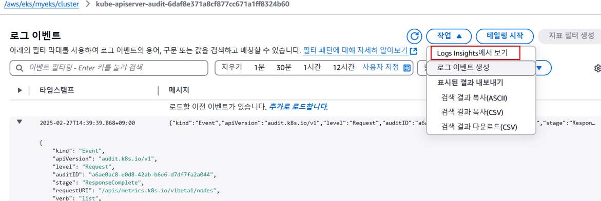 해당 로그들은 CLI에서도 아래와 같은 명령어로 검색이 가능하지만 콘솔에서도 가시성있게 확인이 가능합니다.