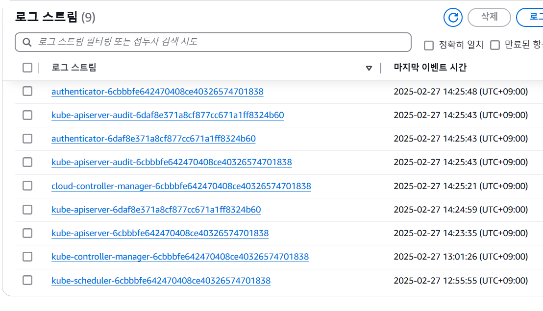 이렇게 Cloudwatch Log Group에 Control Plane의 해당 로그들을 쌓고 있었습니다.