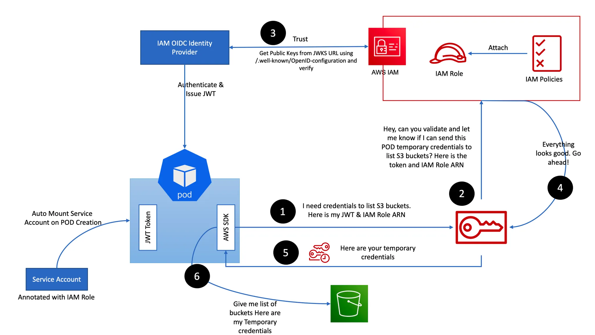즉 AWS 리소스들 혹은 정책들을 AWS IAM에 정의하고 해당 Role을 sa에게 부여해서 해당 pod가 허용된 행동을 할 수 있게 해줍니다.