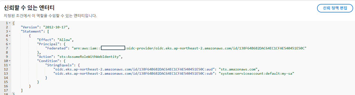 기존에 IRSA을 사용해서 role의 신뢰정책로 sa를 지정하고 pod가 이 sa을 사용하였다면 같은 권한을 지닌 role을 다른 클러스터의 pod가 이용하고 싶으면 해당하는 클러스터에 대한 role을 생성하고 신뢰정책을 구성해야합니다.