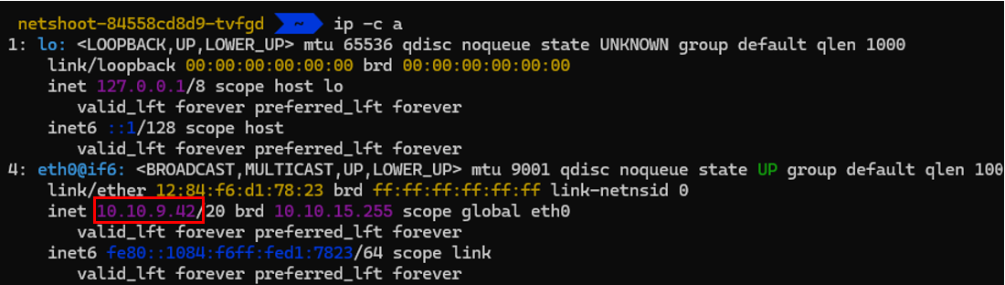 컨테이너의 eh0인터페이스에 해당 노드=파드 ip가 붙어있네요