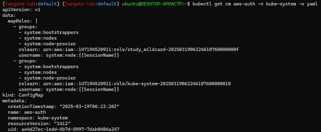 kubectl get cm -n kube-system aws-auth -o yaml