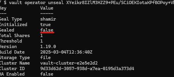 kubectl exec -ti vault-0 -- vault operator unseal <UNSEAL_KEY>