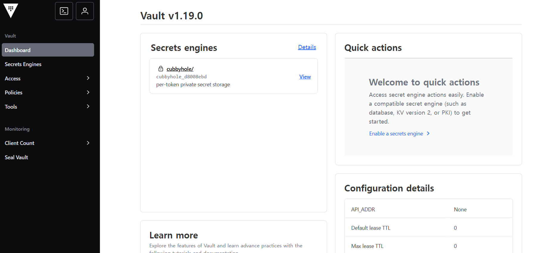 - 강력한 암호화: Secret은 Vault 내부에서 안전하게 암호화되어 저장됩니다.