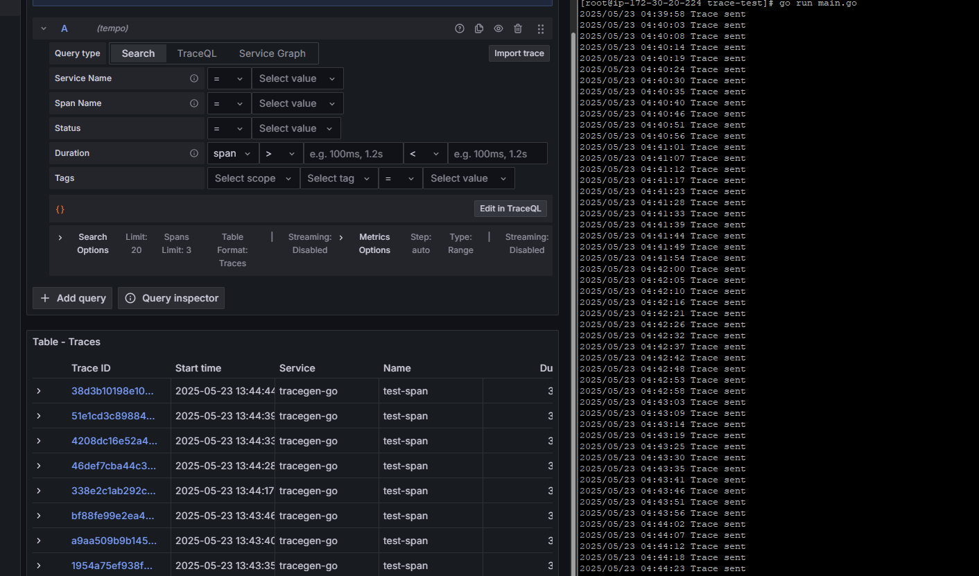 2. Trace는 Grafana Tempo로 Push하여서 Grafana에 표출합니다.