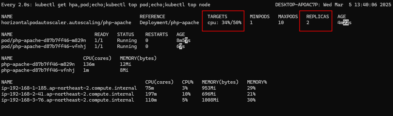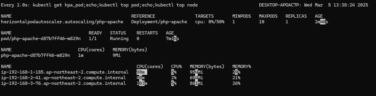 watch -d 'kubectl get hpa,pod;echo;kubectl top pod;echo;kubectl top node'