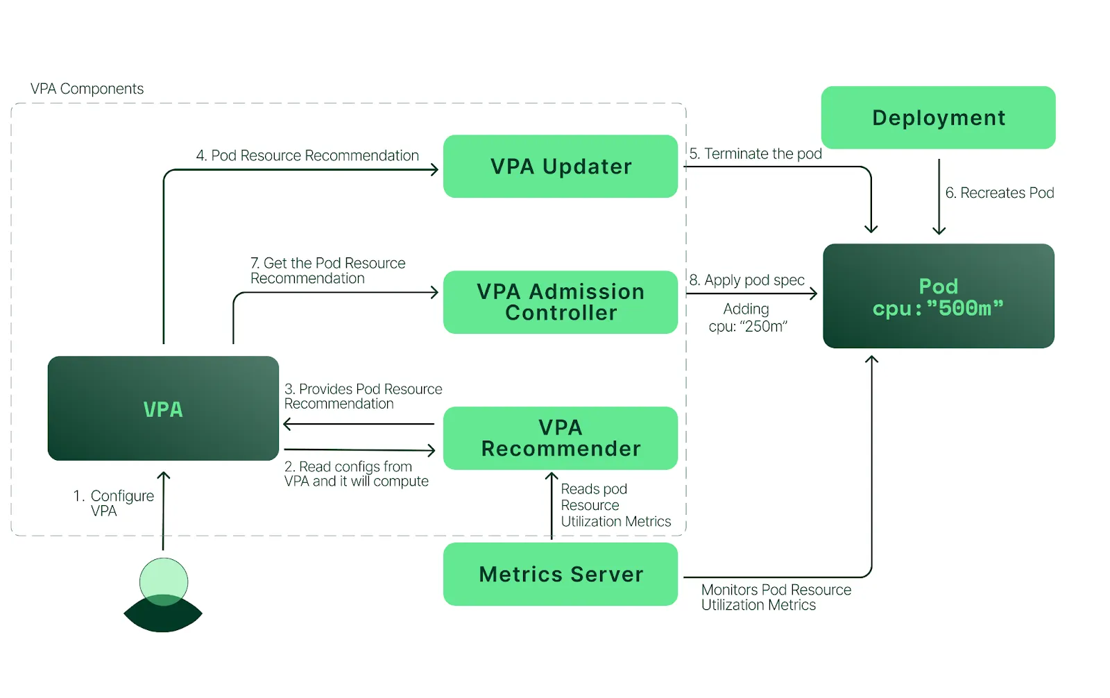 VPA란? VPA(Vertical Pod Autoscaler)는 pod resources.request을 최대한 최적값으로 수정합니다. 수정된 request값이 기존 값보다 위 또는 아래 범위에 속하므로 Vertical라고 표현합니다. pod마다 resource.request를 최