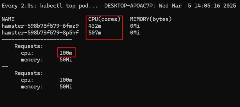 # Since each pod requests 200 milli-cores by kubectl run, this means an average CPU usage of 100 milli-cores.