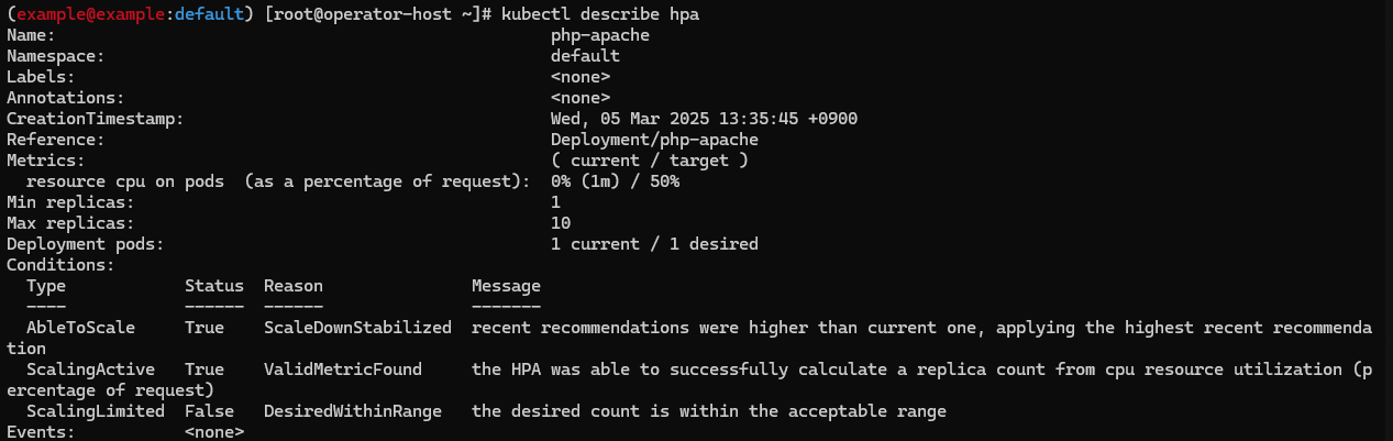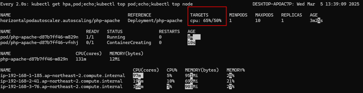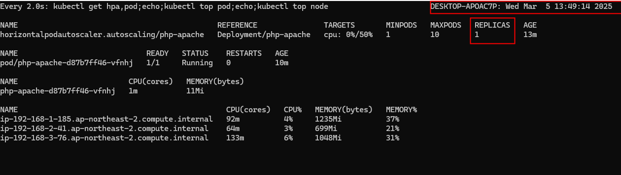 45분에 1개의 php-apache pod가 생성되었음을 확인 가능합니다.